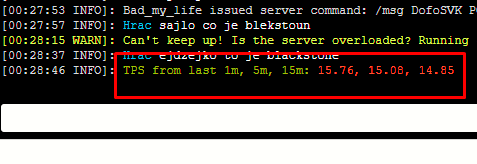 Při zátěži serveru běží hláška v konzoli "[00:30:05 WARN]: Can't keep up! Is the server overloaded? Running 8205ms or 164 ticks behind"